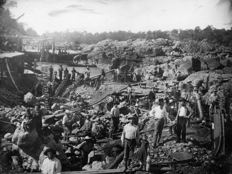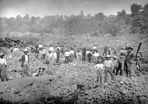 An 1852 photograph showing men Working gravels on the American River near Placerville.