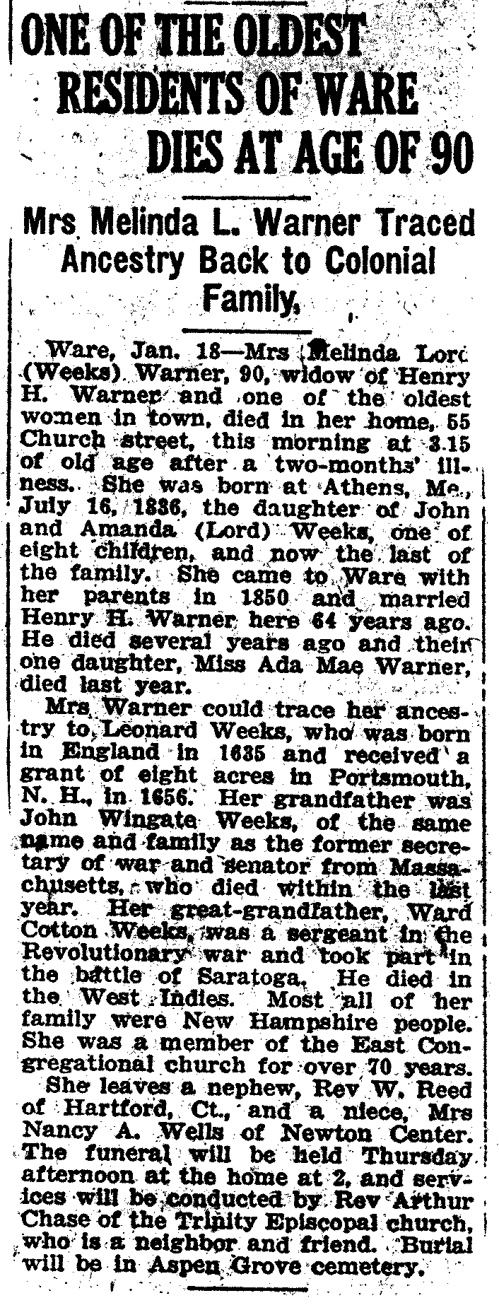 Malinda (Melinda) Lord Weeks (1836-1927) was born July 16, 1836 in Athens, Maine. She married Henry H. Warner (1839-1916) on June 1, 1862 in Ware. They had only one child - a daughter named Ada May Warner (1867-1926). Malinda died in 1927, and she is buried with her husband in Ware in the Aspen Grove Cemetery. Her obituary states that she was one of eight children who came with her family to Ware in 1850, and that was the last surviving member of her family when she passed away.